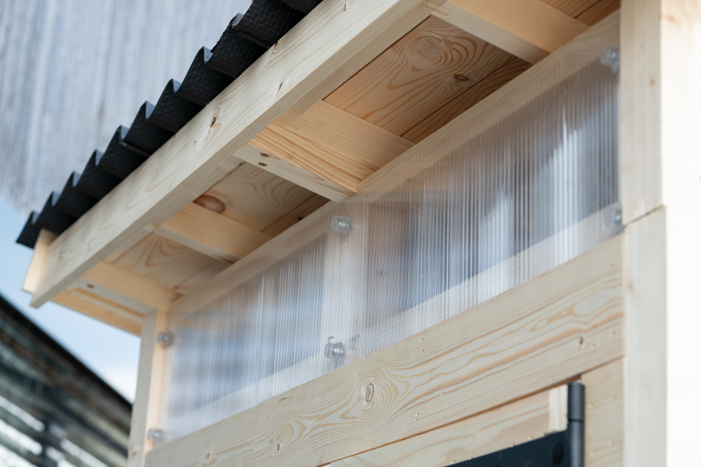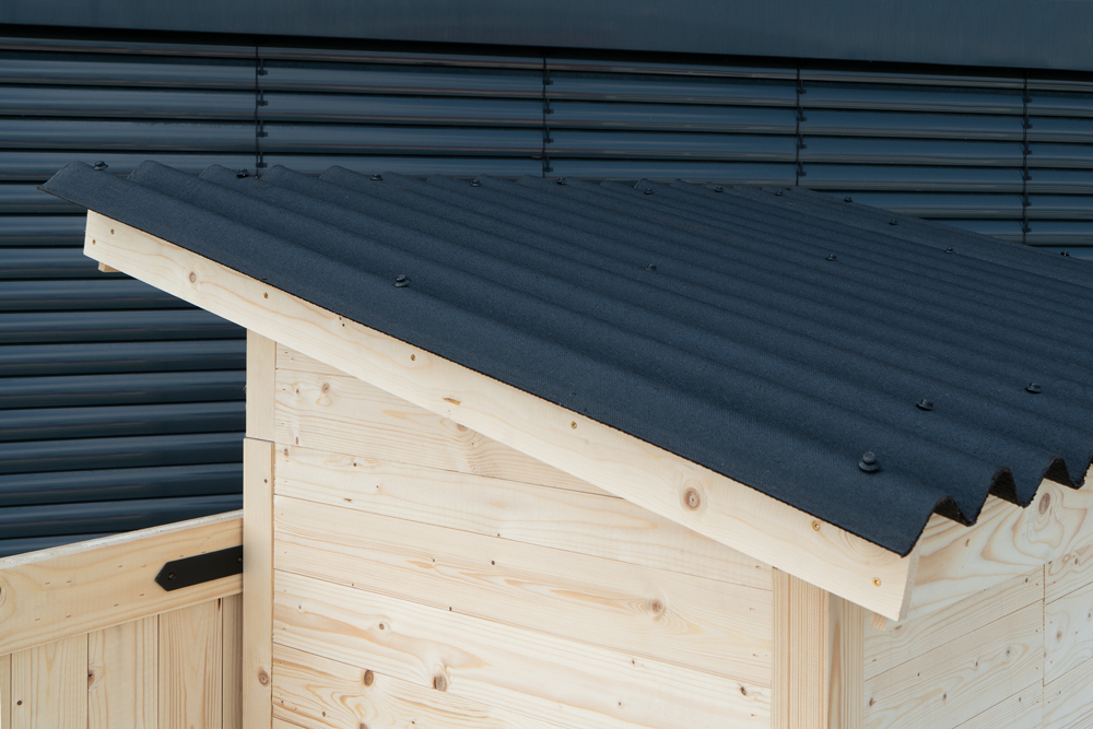 Das Flachdach des Schuppens ist leicht nach hinten geneigt und mit einer wetterfesten, wellenförmigen Dachabdeckung versehen. Dieses Design sorgt für einen optimalen Wasserabfluss und schützt den Inhalt der PALStrongbox zuverlässig vor Regen und Feuchtigkeit. Zudem sind unter dem Dachbereich transparente Einsätze und Luftdurchlässe integriert.