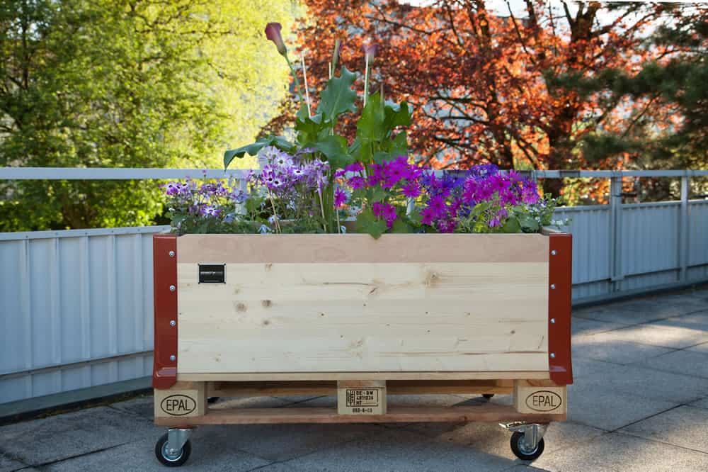 Die ideale Arbeitshöhe erhalten Sie durch Verwenden eines zweiten Hochbeet Rahmens. Zusätzlich wir das Hochbeet durch den Einsatz von Lenkrollen und einer Palette erhöht.