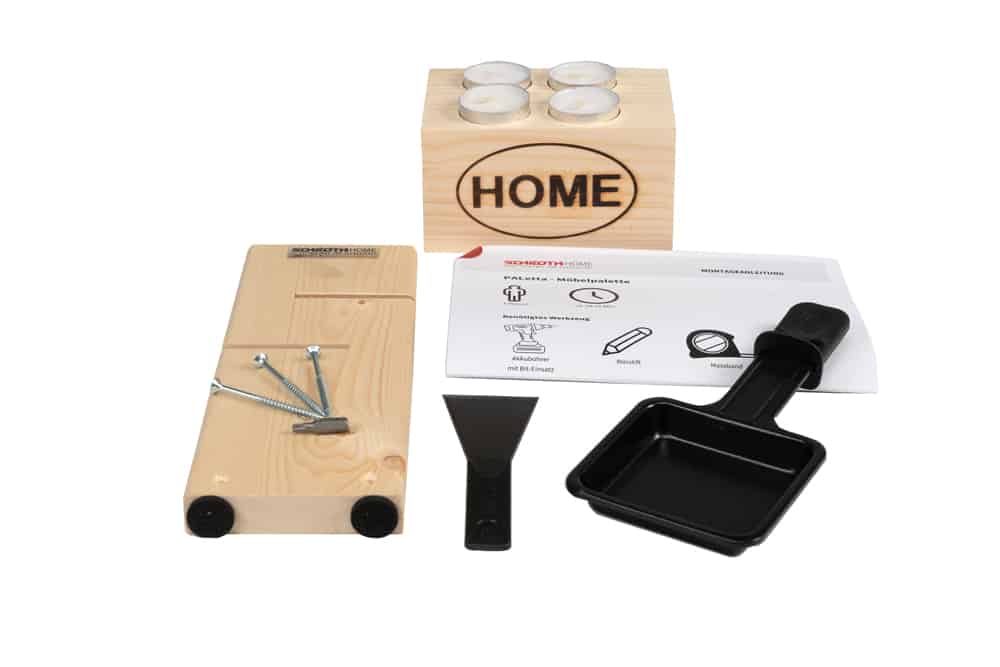 Ohne Strom, überall ein feines Raclette geniessen. Einfach zum Mitnehmen, braucht nicht viel Platz, ist leicht und macht richtig Spass. Das PALraclette wird mit vier Teelichtern betrieben, dazu gibt es Raclettepfännli mit Kunststoffgriff und einen Raclettespachtel aus Kunststoff. In der Rückwand sind zwei Halterungen eingefräst. Der massive Palettenklotz ist mit 4 Filzgleitern unterlegt.